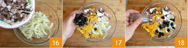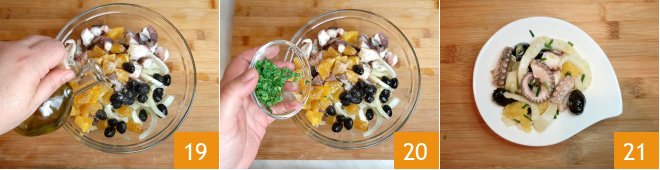 Add the octopus to the fennel 16, add the orange cubes and black olives 17. Season with salt and pepper 18.