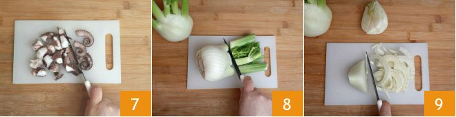 Remove the skin, which will come off easily, then cut the octopus into pieces 7 and set aside. Take the fennel, remove the green part of the fronds 8, and slice the rest 9.