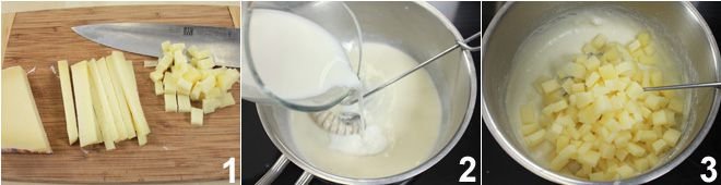 First, prepare the Montasio cream: remove the crust from the cheese and cut it into small cubes 1. Melt the butter in a thick-bottomed saucepan, add the flour and mix well with a whisk, then incorporate the milk 2, continuing to stir to obtain a very fluid béchamel. At this point, incorporate the Montasio cheese 3.