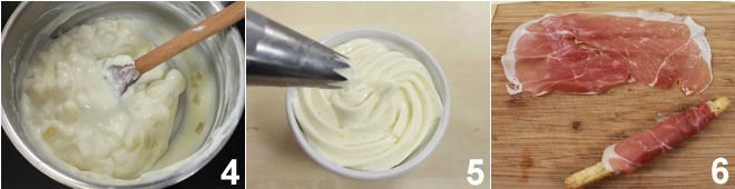 Add the fresh cream and stir continuously to melt the cheese 4. When the cheese is completely melted and you have obtained a smooth cream, adjust the salt and pepper and keep the cream warm by placing it in ceramic ramekins for serving 5. Wrap each olive breadstick with a slice of Sauris prosciutto 6 and serve these delightful snacks accompanied by the Montasio cream!