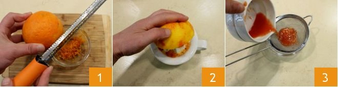 To prepare the olive oil loaf cake, start by grating the orange zest 1, then squeeze out 3.4 oz of juice and filter it with a sieve (2-3).