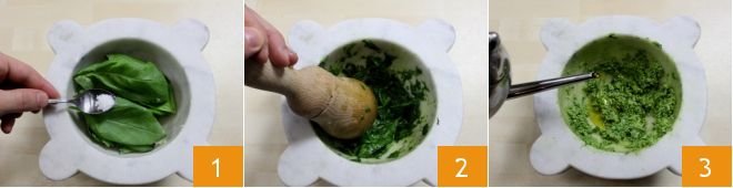 To prepare the omelette with pesto and tomatoes, start with the Genovese pesto (if you already have homemade pesto available, you can use it in the indicated amount). For the complete procedure, you can click on the Cooking School tab found here: Genoese pesto (Pesto alla genovese). Crush the garlic clove into a paste using a mortar and pestle (if you don't have one, you can use a blender). Then add the basil leaves 1 together with a pinch of coarse salt. Crush the basil leaves against the walls of the mortar with the pestle, rotating the pestle from left to right and simultaneously moving the mortar in the opposite direction 2. When the bright green liquid is released from the leaves, add the pine nuts and continue crushing. Then gradually add the grated cheeses, continuing to crush; finally, pour in the extra virgin olive oil in a thin stream 3. Combine the ingredients. Now that the pesto is ready, set it aside covered with plastic wrap.