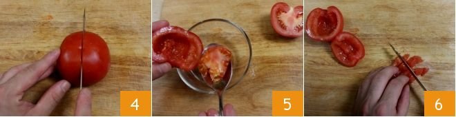 Next, prepare the tomatoes. Wash them under running water, then cut one into cubes: remove the stem and cut it in half 4, then scoop out the inside with a teaspoon to remove the seeds 5. Then cut the pulp into cubes 6 and keep them in a small bowl.