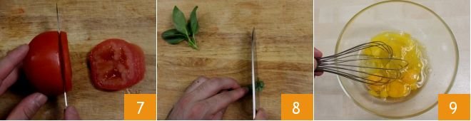 Move on to the other tomato: remove the peduncle and cut the tomato into slices 7 that you will set aside for decoration. Then chop the bunch of fresh basil 8, which you will then add to the omelette. In a bowl, crack the eggs, add salt and pepper to taste, then start beating them with a whisk 9.