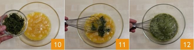 After beating the eggs for a few seconds, incorporate the pesto you set aside 10 and mix with the whisk 11 to obtain a homogeneous mixture 12.