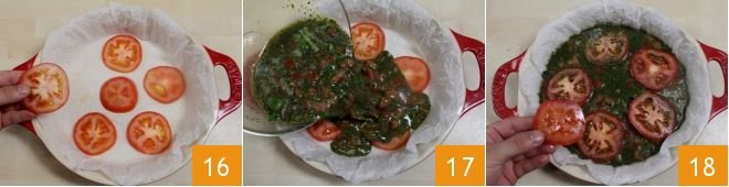 Now you can start assembling your omelette: take a 10-inch diameter cake pan and line it with parchment paper. Then place half of the tomato slices you prepared previously on the bottom 16. Pour the egg, pesto, and diced tomato mixture into the cake pan 17, leveling the mixture so it fills the pan evenly and without gaps. Then finish assembling the omelette by arranging the remaining tomato slices 18.