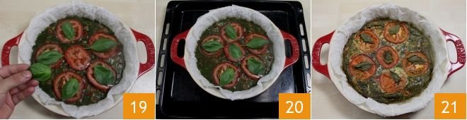 Decorate the omelette with whole basil leaves 19, placing them on each tomato slice to create a contrast of colors. Then bake 20 in a preheated static oven at 350°F for 30-35 minutes or a convection oven at 320°F for about 25 minutes until the surface is golden (you can also cook the omelette in a non-stick pan like a regular omelette). Take the omelette with pesto and tomatoes out of the oven 21, let it cool slightly, and serve it warm or cold to your taste!