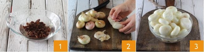 To prepare the recipe for onions with raisins, first soak the raisins for 20 minutes in a glass of lukewarm water 1. Meanwhile, peel the onions 2 and gather them in a bowl 3.