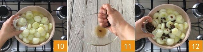 At this point, salt and pepper, and continue cooking for 7 minutes with the pot covered 13. Then deglaze with the Marsala 14, let it evaporate, then cover the pan again and continue cooking for another 7 minutes. At the end, the onions will become tender, and the cooking liquid will have almost completely evaporated 15. Serve the onions with raisins hot.