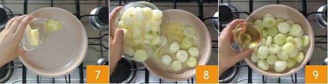 Place a pot full of salted water on the stove and bring it to a boil 4, then add the onions and blanch them for 2 minutes 5. Drain them 6 and set aside.