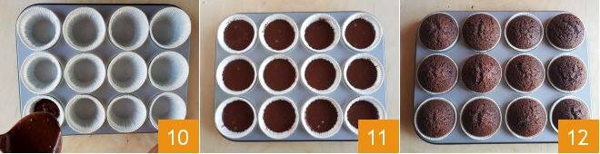 Line a muffin tin with paper liners. Fill the various molds with the batter 10, reaching a little over halfway 11. Bake at 350°F for 25 minutes. Once cooked, remove from the oven and let cool 12.