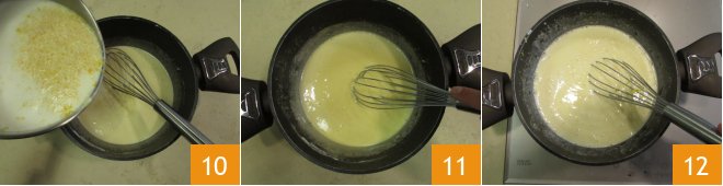 As soon as the milk starts to boil, pour some into the egg yolk mixture 10, to temper it. Then stir 11 and add the remaining milk. Bring the cream to the heat 12 and cook it for about 5 minutes,