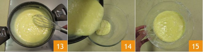 stirring with a whisk, until it becomes smooth and thick 13. Transfer the cream into a bowl 14, cover with plastic wrap in contact 15 and let it cool first at room temperature and then in the refrigerator.