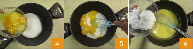 Meanwhile, in another pot, pour the egg yolks and sugar 4. Mix well with a spatula 5, then add the cornstarch 6