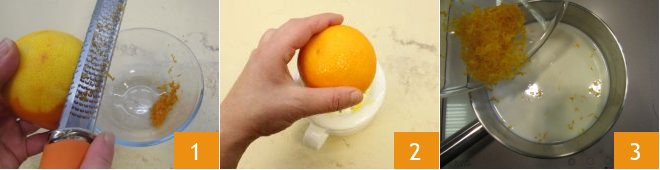 To prepare the orange cream, first grate the zest 1, squeeze the orange 2 and extract the right amount of juice. Pour the milk into a saucepan, add the orange zest 3 and bring to a boil over low heat.