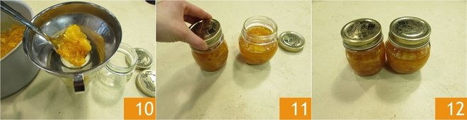 Using a funnel, transfer the hot marmalade into the jars 10, then clean the edges if they have gotten dirty and close with their lids, tightening rather vigorously 11. Turn the jars upside down and let them cool this way before turning them upright again 12. Once the jars have cooled, check if the vacuum seal is intact: you can press the center of the lid, and if you don't hear the classic "click-clack," the vacuum seal is successful. Your orange marmalade is ready, wait a few days before enjoying it!