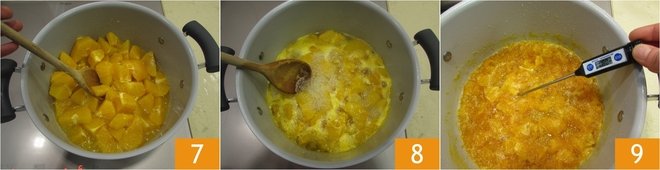 Place on medium heat and as soon as the sugar has dissolved 7 and the pulp has started to break down, lower the heat. Let it simmer, stirring occasionally 8. Using a food thermometer, measure the temperature of the orange marmalade and as soon as it reaches 226°F 9, turn off the heat; it will take about 60 minutes.