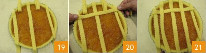 Fill the tart with marmalade, spreading it evenly with the back of a spoon 16. Take the leftover dough, roll it out to a thickness of 1/4 inch. Cut strips of dough with a fluted wheel 17. Now apply the strips of dough by intersecting them: attach 5 strips of dough to the edge of the tart starting with the first 18, spacing the others evenly.