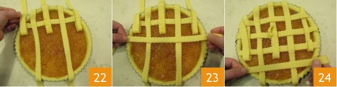 Lift again, this time the first strip, the third, and the last one 22 and lay another one horizontally 23; proceed by folding the vertical strips over the tart and continue with this technique to finish all the strips 24.