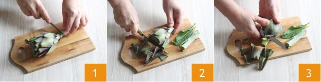 To prepare orecchiette with artichokes, boil plenty of water in a pot and salt it once it's boiling. Clean the artichokes by removing most of the stem, leaving 1-2 inches 1. Cut the tips of the leaves by 1 inch 2, clean the stem 3