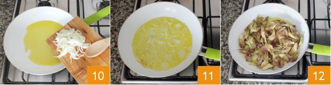 Heat the oil in a pan, then add the onion 10 and let it lightly sauté for 2 minutes on low heat 11. Drain the artichokes and add them to the pan 12. Let them cook for 3-4 minutes over medium heat, stirring often with a wooden spoon.