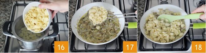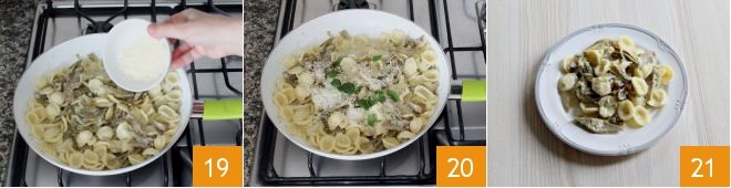 Cook the orecchiette in plenty of salted water for about 7-8 minutes (or the time indicated on the package) 16. Drain the orecchiette, pour them into the pan with the artichokes 17, stir well with a spoon 18.