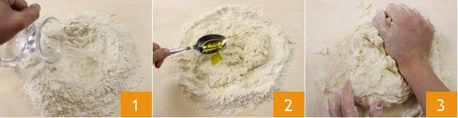 To prepare the orecchiette with broccoli, anchovies, and sun-dried tomatoes, start by making the dough for the Orecchiette: sift the flour into a bowl and transfer it onto a work surface, forming the classic well with a hole in the center (alternatively, you can work the dough in a bowl). Add the water gradually 1 and start kneading (the amount of water varies depending on the flour's absorption). Finally, add the oil 2 and continue kneading 3 until you obtain a very smooth and soft dough to which you will give a round shape.