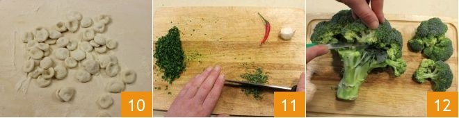At this point, place each shell on the tip of your thumb and turn it backward to create your orecchiette 10. Chop the thyme 11, remove the stem and seeds from the chili pepper, and chop it finely. If desired, chop the garlic or leave it whole. Separate the broccoli florets 12 and cut them into small pieces. Remove the tougher outer part of the stem and cut it into small pieces.