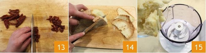 Drain the sun-dried tomatoes and dry them with a kitchen cloth, then cut them into pieces 13. Remove the crust from the loaf 14, chop it coarsely, then mince it finely in a mixer 15.