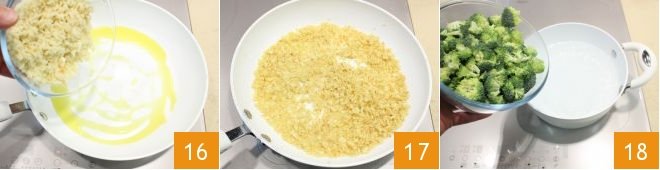 Heat the oil in a pan (at this step you can also add half of the minced herbs), then add the breadcrumbs 16 and toast them for a few minutes until they become crispy 17. When golden, turn off the heat and immediately transfer them to a bowl to prevent further cooking in the hot pan, which could burn them. In a deep pot, bring plenty of salted water to a boil, add the broccoli florets and stem pieces 18, and cook them for two minutes after the water returns to a boil; they should remain crisp.