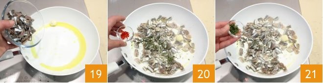 Meanwhile, heat a drizzle of oil in a pan, add the garlic clove (if you left it whole), the anchovies 19, the chili pepper 20, and the chopped thyme 21. Sauté the anchovies just long enough to lighten their color.