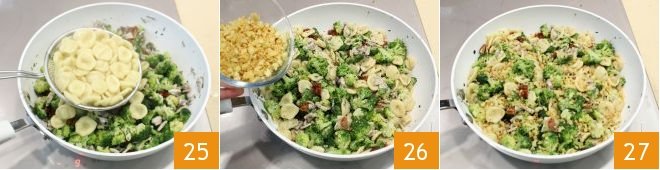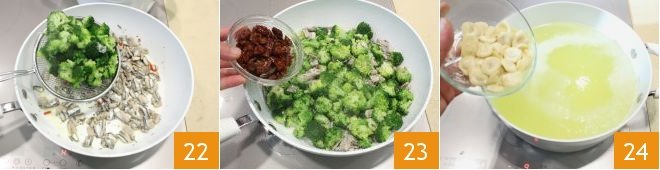 By now the broccoli will be ready, directly drain them into the pan with the anchovies 22, and add the sun-dried tomatoes 23. In the broccoli cooking water, cook the orecchiette (alternatively, you can cook them together with the broccoli)
