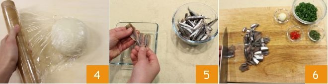 Wrap the semolina dough in plastic wrap 4 and let it rest at room temperature for about 30 minutes until the dough becomes very elastic. In the meantime, clean the anchovies: remove the head and entrails 5, open the fish to remove the central bone and tail, thus obtaining two fillets, rinse them gently under running water, then cut into pieces 6 and set aside.