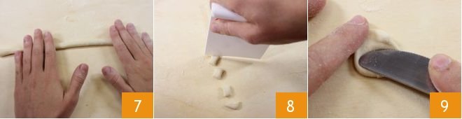 Take the dough again, place it on a floured work surface, divide it into thin sticks 7, and then cut these into little pieces about 3/8 inch each 8. Using a rounded-tip knife, drag each piece of dough on the work surface so that the dough curves. During this operation, hold one side of the dough piece steady with the other hand 9.