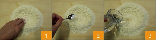 To prepare the orecchiette pasta, first pour the remilled durum wheat semolina flour on the pastry board, form a fountain 1 and add a pinch of salt to the flour 2. Pour the water at room temperature in the center 3