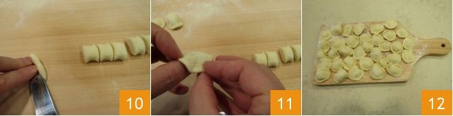 With the help of a butter knife, form small shells by dragging each piece of dough towards you on the pastry board 10. Then turn the shell back on itself 11. Continue until you finish all the dough and you will have made your Apulian orecchiette pasta 12.