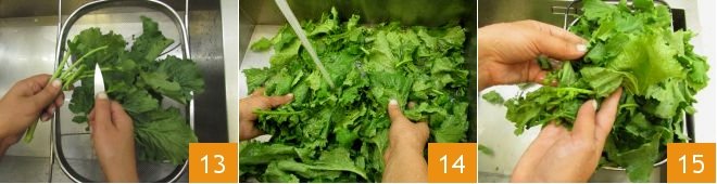 For the broccoli rabe: clean them by removing the outer leaves and with a small knife (or with your fingers) take only the inner leaves and the flower 13. Once ready rinse them 14, drain them 15, dry them well, and set them aside. In the meantime, heat a pot with plenty of water, salted to taste, which will be used to boil the broccoli rabe.