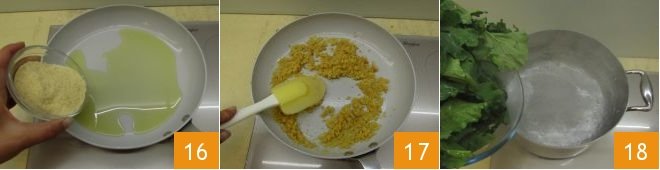 In a large skillet pour half of the oil and add the breadcrumbs 16, mix with a rubber spatula and let it toast over medium heat, until golden brown 17, then set aside. As soon as the water has started to boil, cook the previously cleaned broccoli rabe 18 for about 5 minutes.