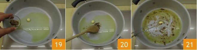In the meantime, prepare the sauté: in a frying pan pour the remaining oil, an unpeeled crushed garlic clove, and the drained anchovy fillets 19. Mix with a wooden spatula to dissolve the anchovies in the skillet 20; it will only take a few minutes for the fried anchovies to flavor the sauté. When ready, remove the garlic 21 and turn off the heat.