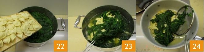 After cooking the greens for 5 minutes, add the orecchiette pasta 22 in the same pot and cook for another 5 minutes or so. Mix gently 23, then drain and place the orecchiette pasta and broccoli rabe into the skillet with the sauté 24.