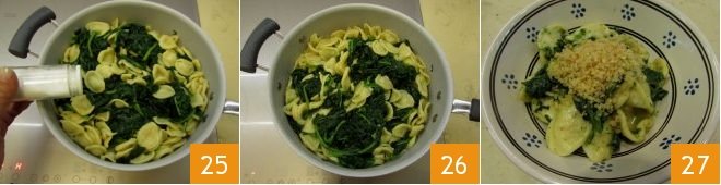 Stir fry briefly and add salt to taste 25; once ready, turn off the heat 26 and place your orecchiette pasta with broccoli rabe on a plate, finishing off with a drizzle of oil and the toasted breadcrumbs 27.
