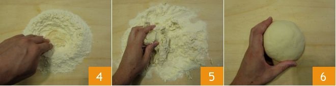 and start working with your fingers 4 to incorporate the flour. Knead 5 until the dough is smooth and elastic. It'll take about ten minutes. Give the dough a round shape 6 and cover it with a cloth: it should rest at room temperature for about 15 minutes.