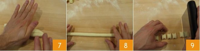 After this time, take a piece of dough, covering the rest with a cloth. Make a roll about 1/3-inch (1 cm) thick (7-8). Using a pastry cutter, cut small pieces about 1/3-inch (1 cm) long 9.