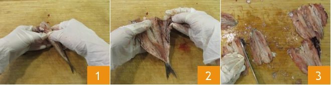 To prepare the orecchiette with sardines and cherry tomatoes, start with the How to Clean Anchovies: after rinsing the sardines, remove the head and split them in half with a knife, starting from the belly 1. Open like a book to detach the central bone 2 and make sure to remove the side fins, on the back and the belly. Roughly chop the sardines and set aside 3.