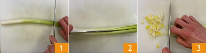 To prepare the orzo with leeks, robiola, and hazelnuts, first take care of the leeks. Remove the roots and the green parts 1, with which you can make a vegetable broth. Cut the leeks in half 2 and then into very thin slices 3.
