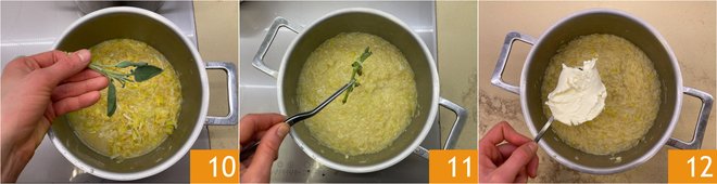 Add the sage 10 and cook. Remove the sage 11 and, off the heat, add the robiola 12.
