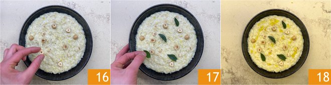 Finish with the hazelnuts 16, some fried sage leaves 17, and a drizzle of raw oil. The orzo with leeks, robiola, and hazelnuts is ready to be enjoyed 18!