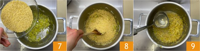When the leeks are soft, add the orzo 7, give it a stir 8 to quickly toast it, then pour in vegetable broth 9 to cover.