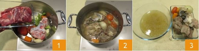 To make the ossobuco with peas, start by preparing the Beef Broth: wash and peel the vegetables and place them in a large, high-sided pot with the oil. Season with whole peppercorns and cloves. Add the meat 1 and cover with 3 quarts of water. Let it cook over medium-high heat for about 2 hours, until the broth reduces by about half. Then add the remaining quart of water and let it cook for another hour over low heat. At the end of cooking 2, strain the broth through a fine-mesh sieve 3.