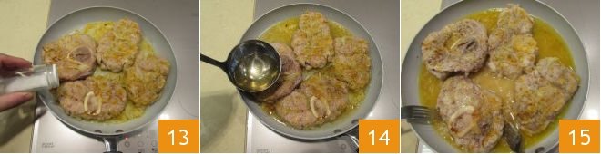 season with salt 13 and pepper, then moisten the meat with the broth 14. Continue cooking over low heat for 1.5 hours, covering with the lid but leaving a vent. Halfway through, turn the ossobuco cuts 15